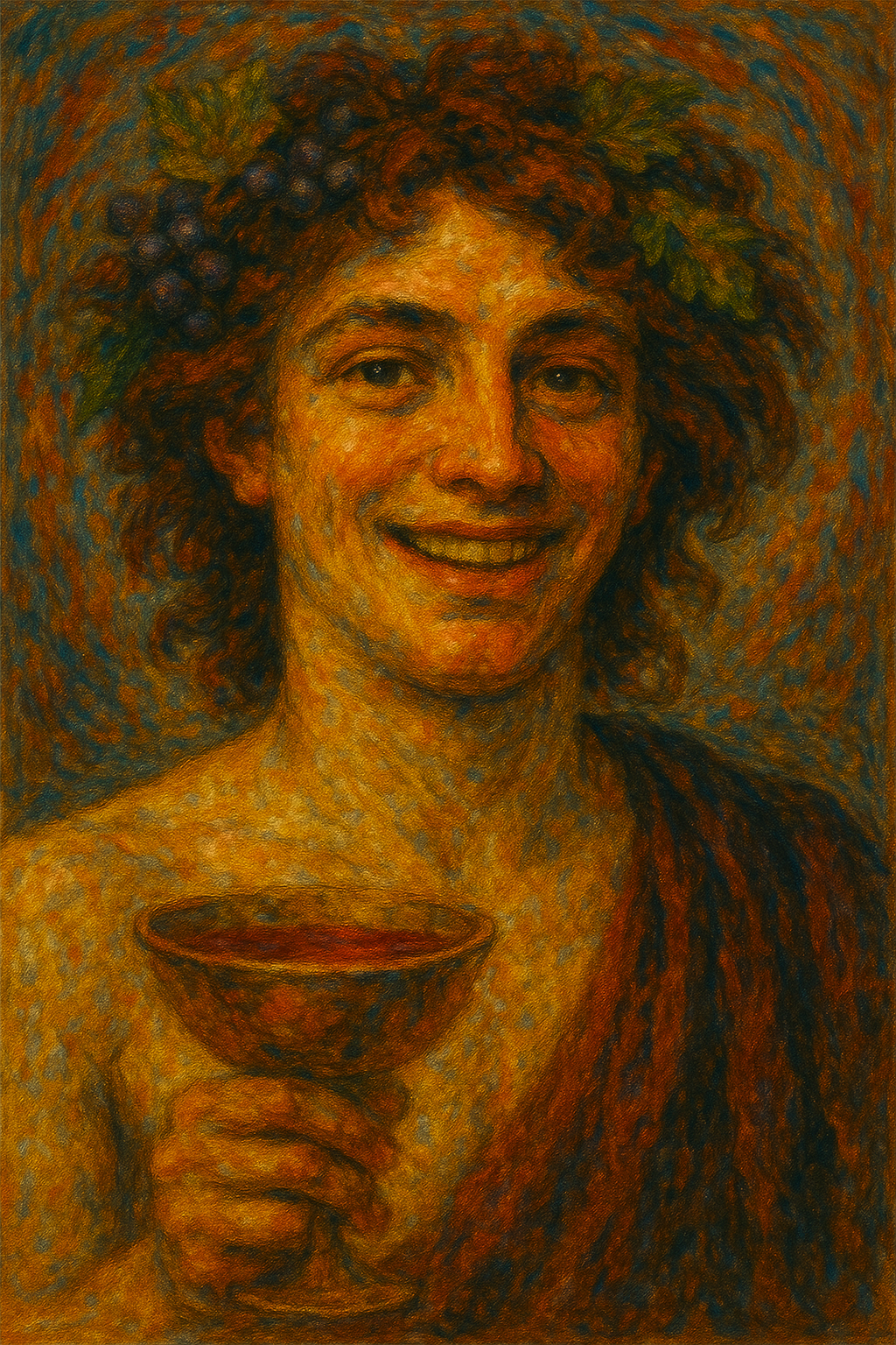 Dionisos, dios del vino y del éxtasis, fascinante, iconoclasta, fusión de lo humano y lo divino, emerge como el artífice del teatro, inspirando la creación y encendiendo la pasión en el corazón de Magín.